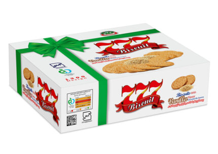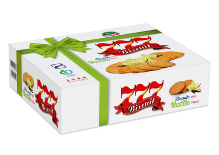 بیسکویت 1300 وانیل و کنجد 777 که در قالب گرد و وزن 1.1 کیلوگرمی با طعم خوش وانیل و تزیین