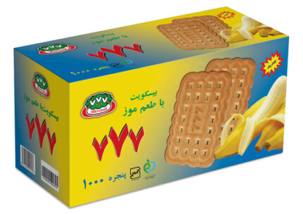 بیسکویت 1900 موزی 777 که در قالب زبان و وزن 1.6 کیلوگرمی با طعم خوش موز تولید می شود، یکی